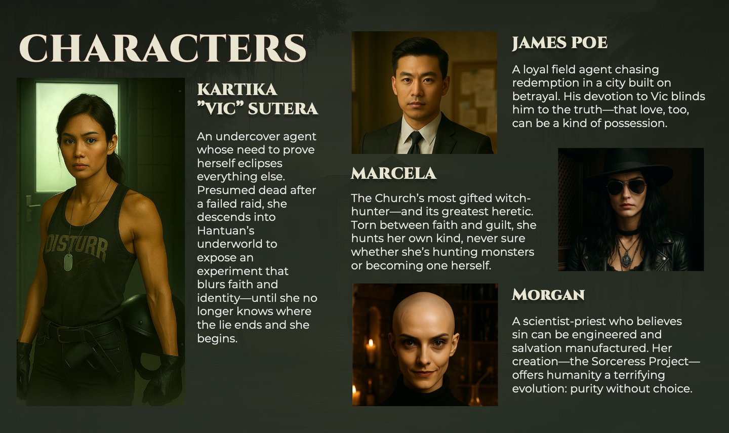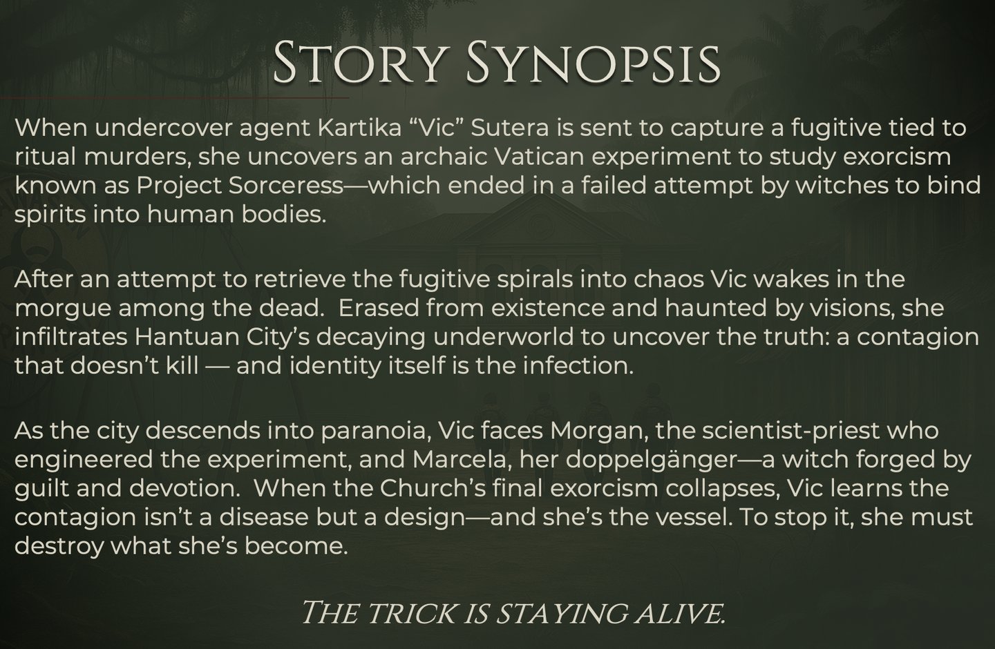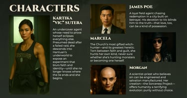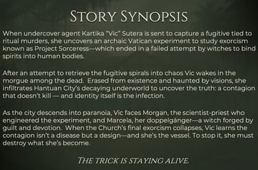 When an undercover agent investigates a string of ritual murders, she uncovers a secret order using human bodies as vessels for an ancient experiment. Hunted by the police, she must uncover who’s controlling the monsters — before she becomes one of them.